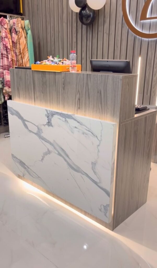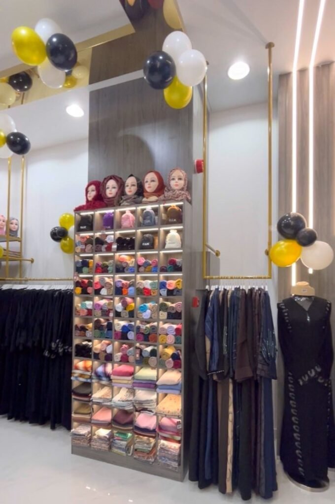 Designing an abaya shop interior involves creating a space that reflects elegance, sophistication, and modesty while providing a comfortable shopping experience. Here are some interior details and design ideas: Use sleek racks or brass rods to hang abayas, keeping them neatly organized and easily accessible.